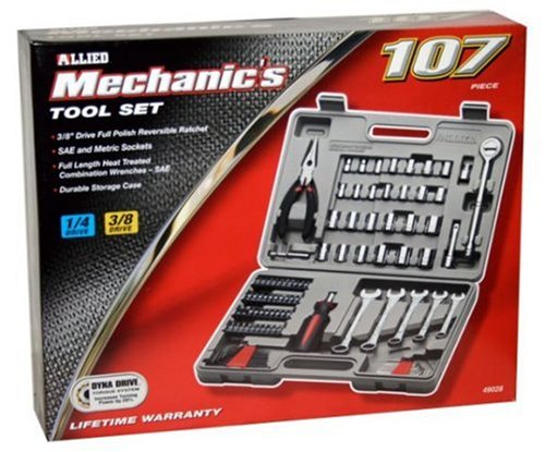 The Allied International 49028 107-Piece Automotive Tool Set provides a full set of tools for work on your car. Parts include a variety of wrenches, bit driver, cushion grip pliers, 3/8-inch and 1/4-inch standard sockets, and a 3/8-inch full polish reversible ratchet. This set is backed by a lifetime warranty.